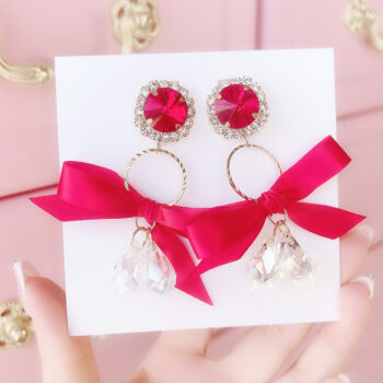 キラキラストーンに愛らしいRibbonモチーフをあしらい、とっても可愛く仕上げました。ボトムのクリスタルストーンは、揺れるたびに透明感を増し、華やかに顔まわりを彩ります♡ガーリーコーデからオルチャンファッションまで、幅広いコーディネートに愛用していただけます。SNS映えも間違いなし♡ -