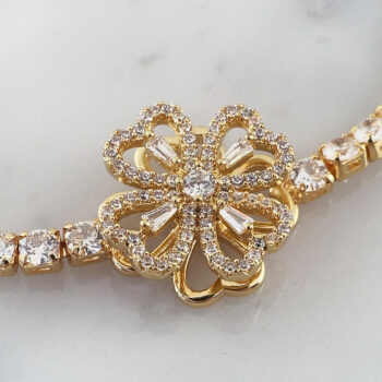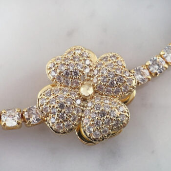 幸運のシンボル「四つ葉のクローバー」。キュービックジルコニアストーンの輝くクローバーモチーフは華やかさをプラスオン♡全方位にストーンを敷き詰め、どの角度から見てもゴージャスで煌びやかな印象を与えてくれます。メッキはゴールドカラーでジュエリー感たっぷりのブレスレットです。シーズンレスで着用でき、場面も選ばないので贈り物にも最適です。金属アレルギーの主な原因となるニッケルを含まず、お肌に優しい仕上げとなっています。フリーサイズで着脱も簡単です♡