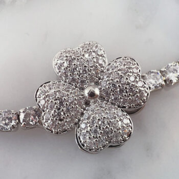 幸運のシンボル「四つ葉のクローバー」。キュービックジルコニアストーンの輝くクローバーモチーフは華やかさをプラスオン♡全方位にストーンを敷き詰め、どの角度から見てもゴージャスで煌びやかな印象を与えてくれます。メッキはシルバーカラーで洗練されたクールな装いに♡ジュエリー感たっぷりのブレスレットです。シーズンレスで着用でき、場面も選ばないので贈り物にも最適です。金属アレルギーの主な原因となるニッケルを含まず、お肌に優しい仕上げとなっています。フリーサイズで着脱も簡単です♡