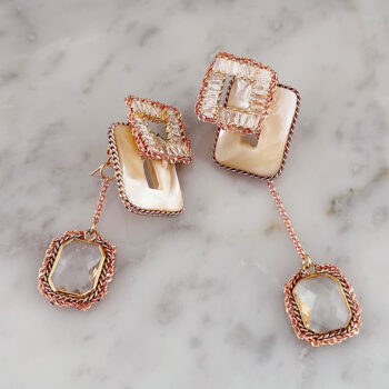 2wayでも楽しめるアシンメトリーのスクエアデザイン。チェーンのクリスタルストーンはキャッチに付いているので、ショートアクセサリーとしても楽しめます。一品一品丁寧に手作業で施されていて、高級感溢れる品物です。顔まわりを洗練された大人の上品さを引き出してくれます。ご自身用としてはもちろん、贈り物にも最適なアイテム♡ -