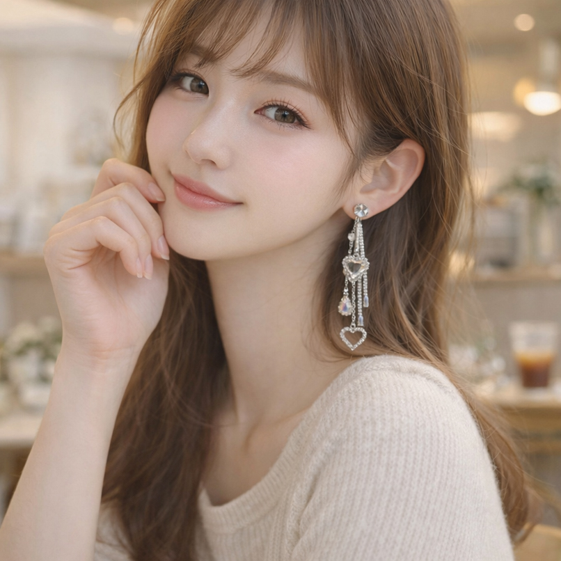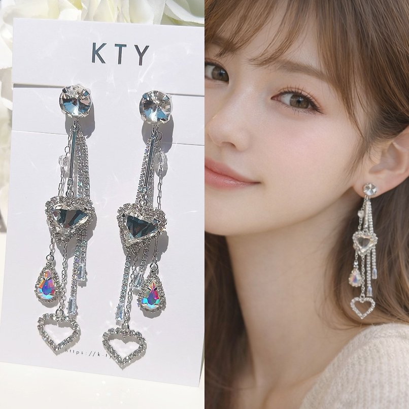 クリスタルの優美なハートモチーフ、オーロラに煌めくドロップ、キュービックジルコニアストーンをあしらったチェーンが華やかさをプラスオン。付け心地は軽く、身につけやすいのも魅力的♡アイドルのような煌びやかな顔周りを演出し、ゴージャスな印象を与えてくれます。※トップのストーンの大きさは、ピアス(10mm)、イヤリング(8mm)となります。写真を見てご確認ください。