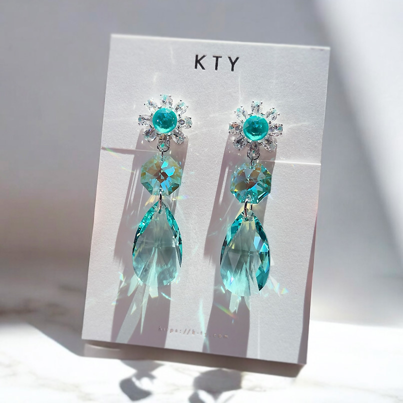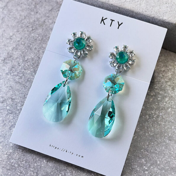 様々なシチュエーションに合わせられる、Jewel Drop Green ピアス&イヤリング。トップはシルキーセージのダイヤモンドのように美しい輝きを持ったストーンを使用し、真ん中はグリーンにABカラーを加えオーロラのような輝きもプラス。高価なストーンを贅沢にあしらい、身に着けると目を奪われるほど美しい♡シーズンレス着用していただけます。また、大切な人への気持ちを伝えるプレゼントとしても最適です。