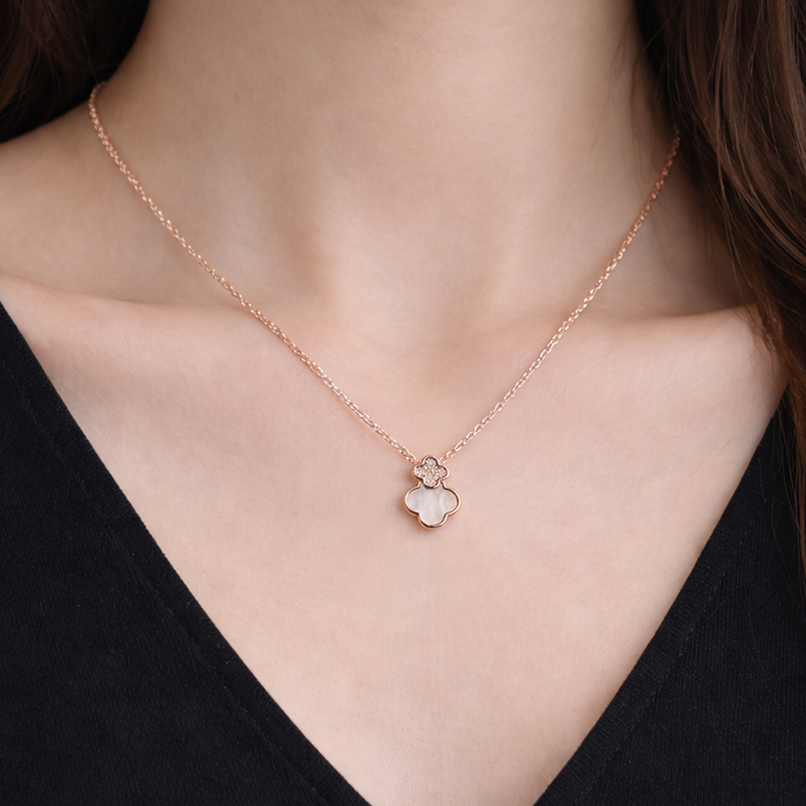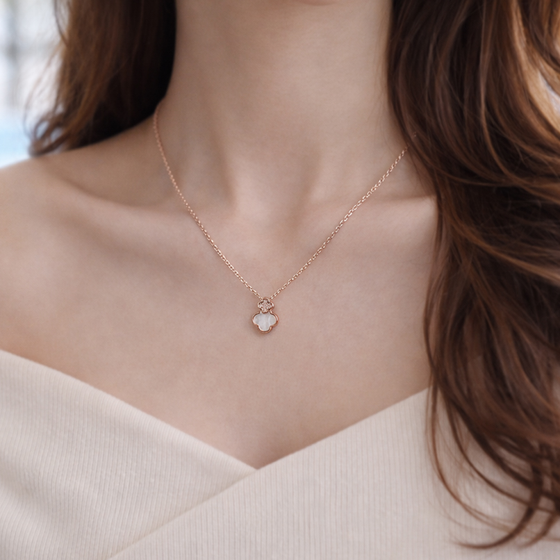 シェル&クローバーデザインが愛らしく可憐な印象を与えてくれる、Shell Asymmetry Clover ネックレス【ニッケルフリー】。