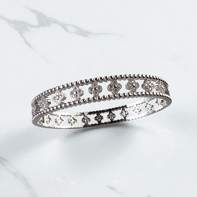 幸運のシンボル「四つ葉のオープンクローバー」。キュービックジルコニアストーンの輝くクローバーモチーフは華やかさをプラスオンしてくれる、Luxury Open Clover motif ブレスレット/ silver。全方位にストーンを敷き詰め、どの角度から見てもゴージャスで煌びやかな印象を与えてくれます。メッキはシルバーカラーでジュエリー感たっぷりのブレスレットです。シーズンレスで着用でき、場面も選ばないので贈り物にも最適です。高品質のメッキで、耐久性に優れ変色しにくく、長くご愛用いただけます。