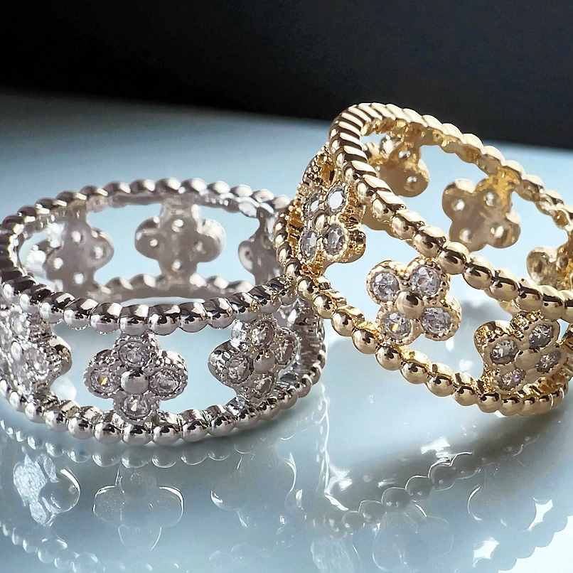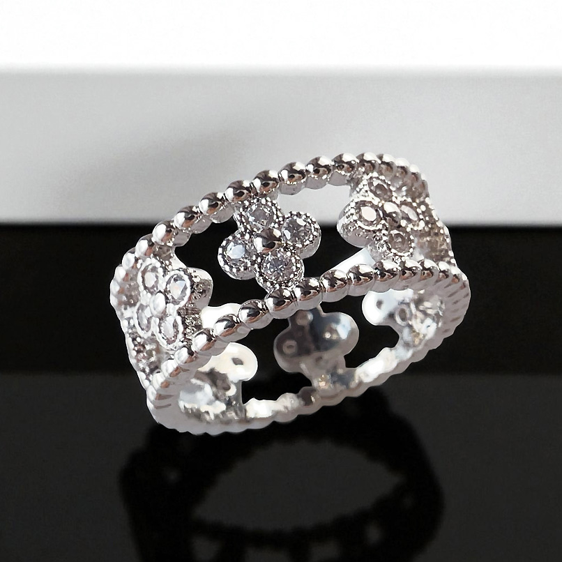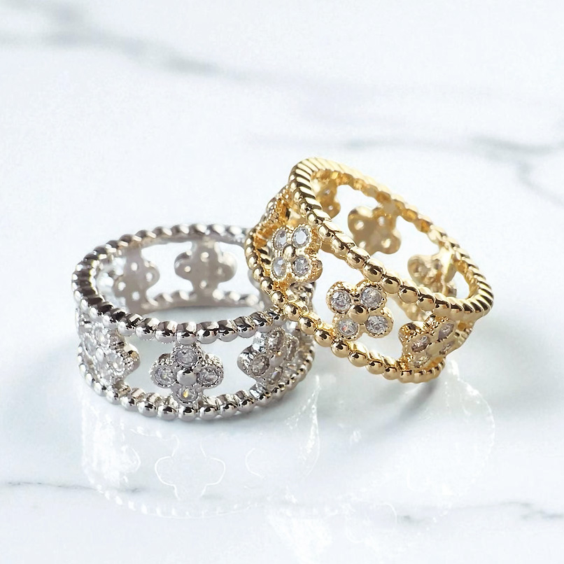 幸運のシンボル「四つ葉のオープンクローバー」。キュービックジルコニアストーンの輝くクローバーモチーフは華やかさをプラスオンしてくれる、Luxury Open Clover motif リング/ silver。全方位にストーンを敷き詰め、どの角度から見てもゴージャスで煌びやかな印象を与えてくれます。メッキはシルバーカラーでジュエリー感たっぷりのリングです。シーズンレスで着用でき、場面も選ばないので贈り物にも最適です。高品質のメッキで、耐久性に優れ変色しにくく、長くご愛用いただけます。